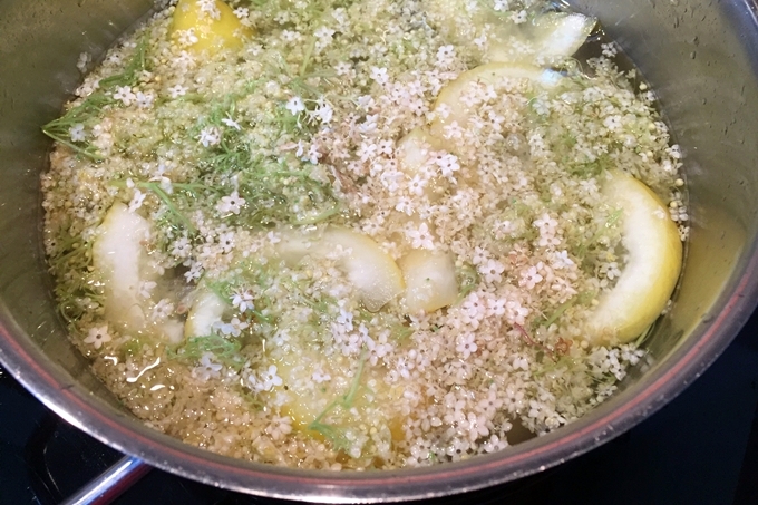 Añadimos los limones cortados al almíbar y a continuación las flores de saúco. Lo removemos bien y en el momento que vaya a hervir lo retiramos del fuego.