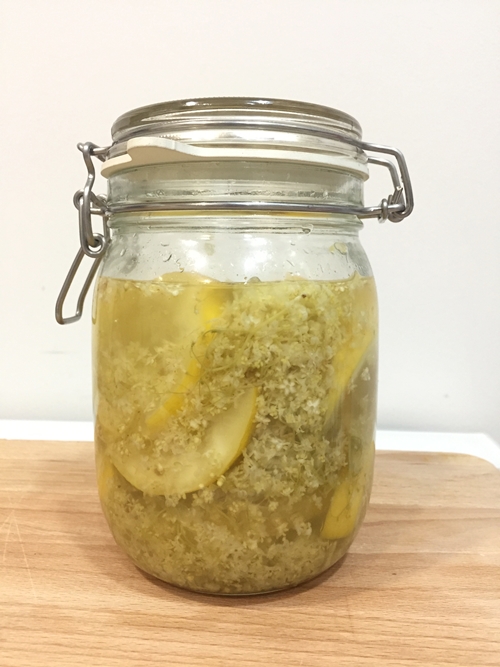 Añadimos los limones cortados al almíbar y a continuación las flores de saúco. Lo removemos bien y en el momento que vaya a hervir lo retiramos del fuego.